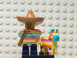 The pinata boy is wearing a Mexican poncho and a sombrero, and is holding a stick with a colorful horse pinata beside him.