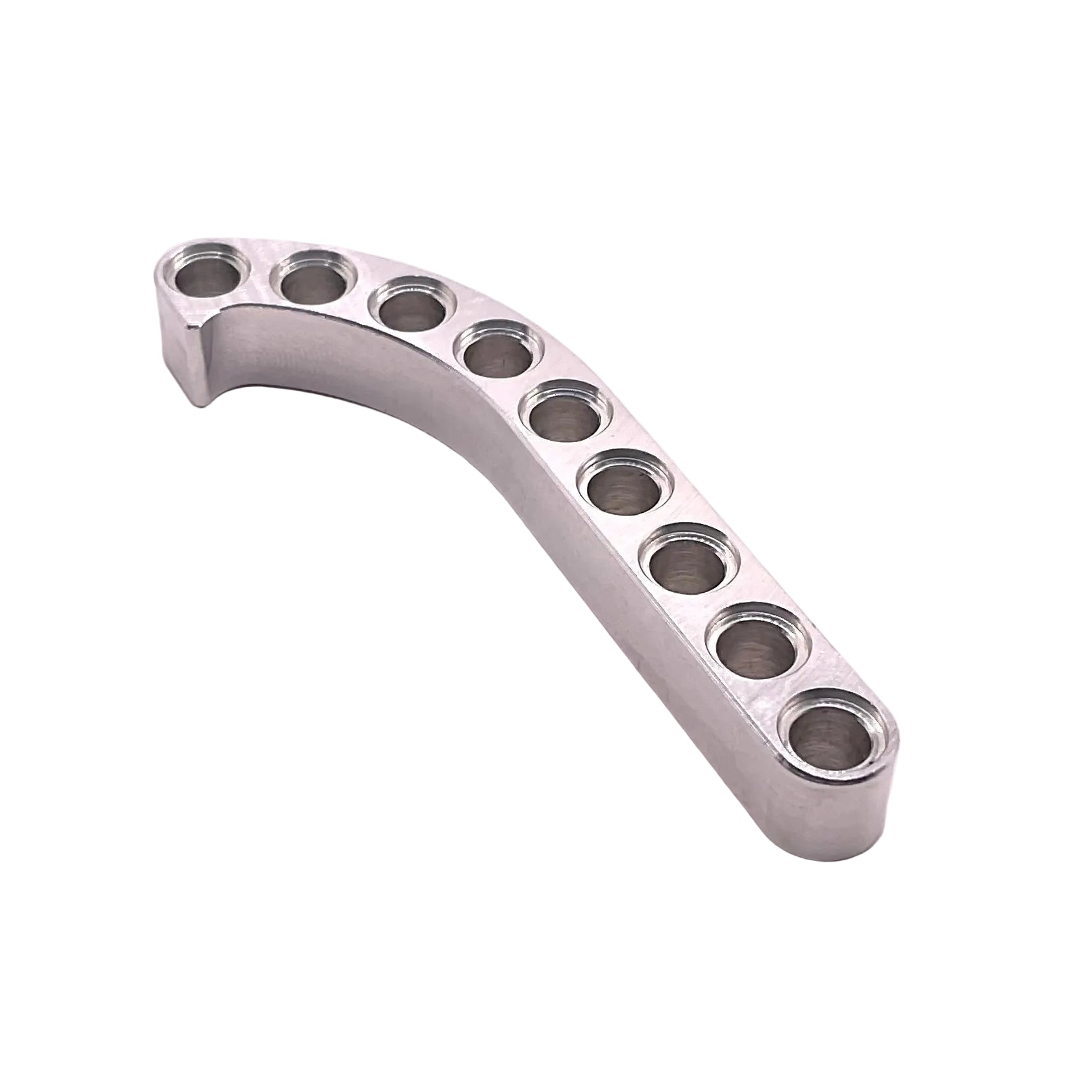 Aluminum 1x9 curved Liftarm. All 9 holes are non-threaded and compatible with standard plastic technic pins.