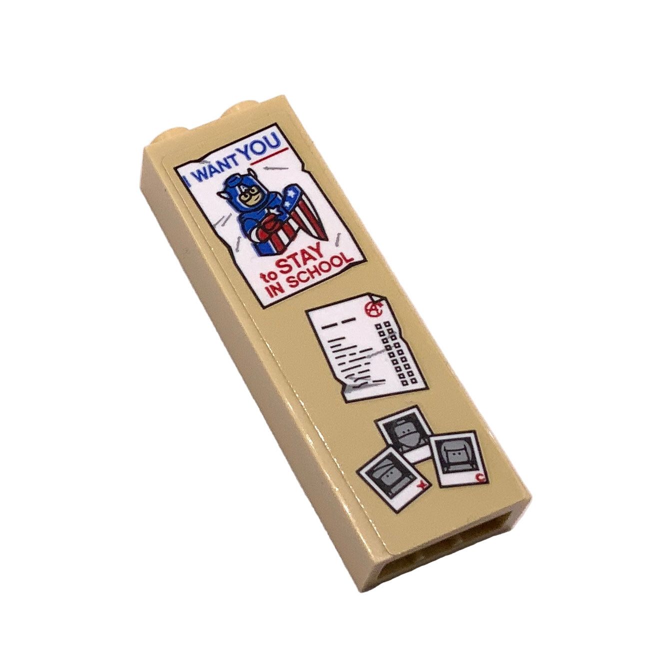 Brick 1 x 2 x 5 with Notice Board with Captain America Poster and Polaroid Photographs Pattern (Sticker), LEGO® Part# 2454pb177.