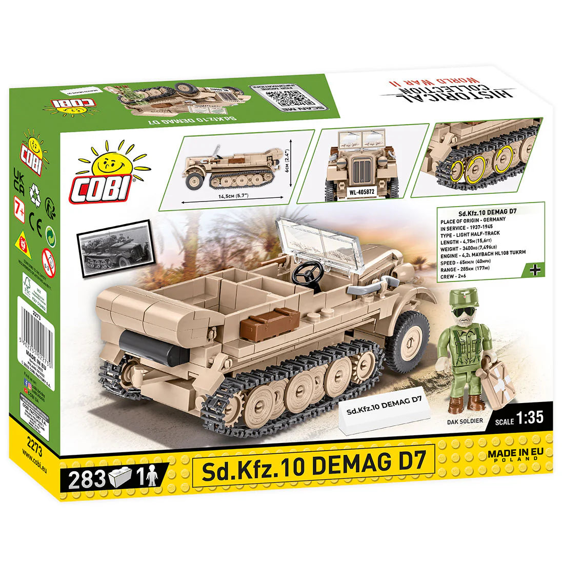 The COBI Sd.Kfz.10 artillery tractor was designed with attention to detail in a 1:35 scale model, using 290 elements. It contains moving parts and high-quality, durable prints. The set perfectly complements the growing collection of historical block vehicles in 1:35 scale. It will definitely find a place in your collection alongside Blitz trucks, Horch cars and other amazing vehicles released in the same series and scale by COBI. The set includes a figure of an Afrika Korps soldier. There are additional accessories on the vehicle, like a new type of box, a spade and a crowbar.