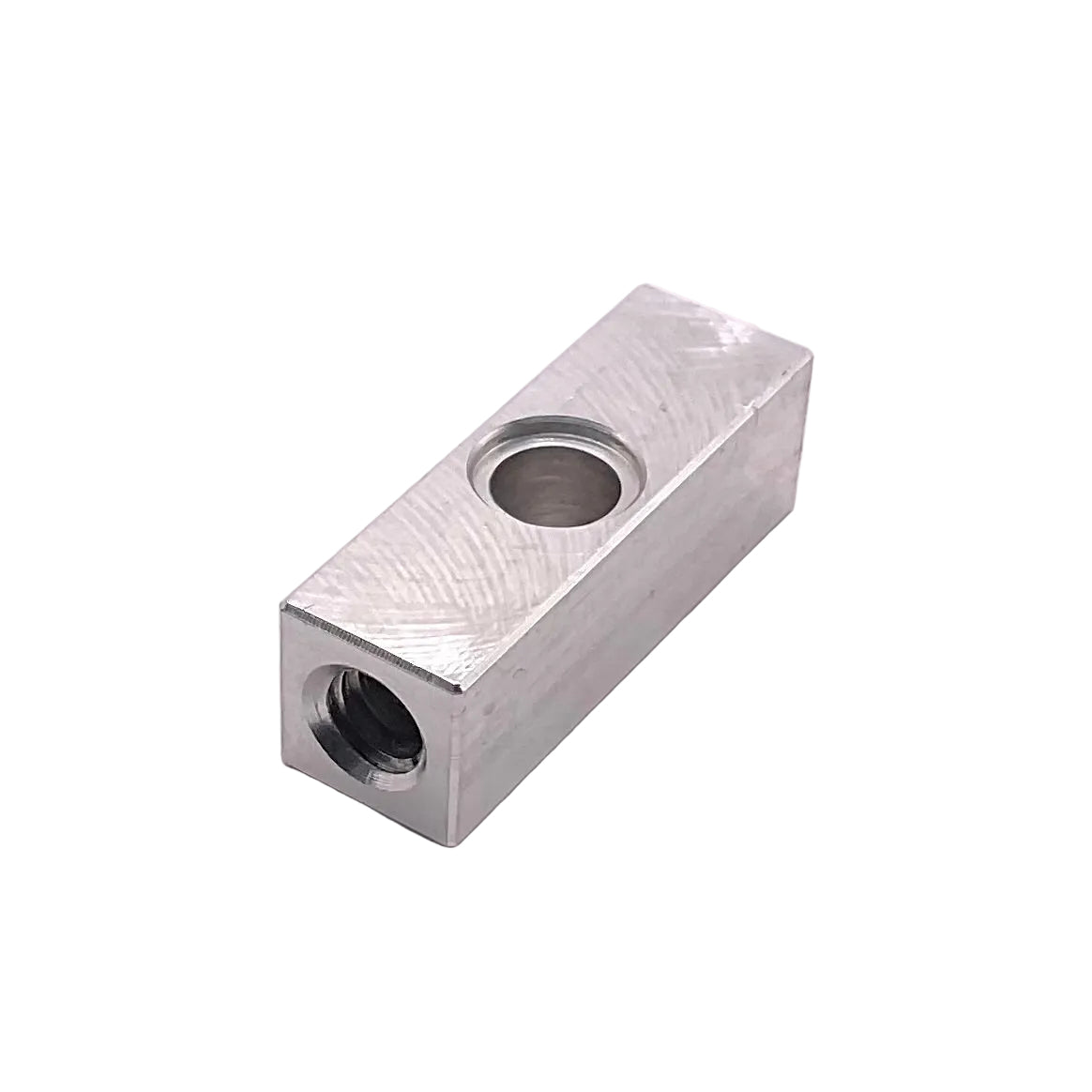 Aluminum 1x1 Liftarm w/ threaded screw hole on both ends. The hole in the center of the liftarm is non-threaded and compatible with standard plastic technic pins. Screw size is #10 machine screw, 24 TPI Coarse.