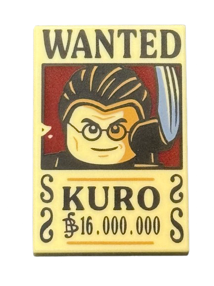 Tile 2 x 3 with Wanted Poster with Black 'WANTED' 'KURO' (Berry) '16.000.000' Pattern, Part# 26603pb533